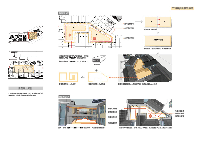 九巷十坊位于苏洵公园之内,公共生活在现场存在生发基础,从城市性格上,商业街是更适合当地人生活趣味的商业形式,因此通过与外部动线的合理交接、公园景观的引入以及停车场等功能和标识系统,满足城市各种可达方式需求的同时完成公园与商业街的使用者分流。