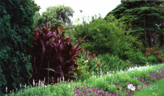 第二,完成了单株植物的组合后,设计师紧接着应考虑“组”或“群”之间的关系。各“组”或“群”之间的群体差异.对景观的影响较大,如何进行景观差异的过渡,首先应十分了解植物群落的景观特性。根据前面分析过的内容.从色香、阴阳、大小进行综合考虑;各“组”“群”虚实相互交织,消除植物“组”“群”之间空隙所形成的“废空间”。