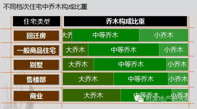而软景配置比例中,乔木、灌木、草坪的所占比例根据项目档次定位不同而不同。