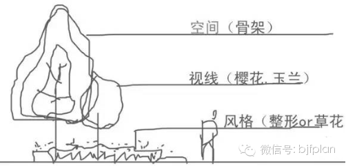 在一个组团内要考虑植被的立面效果,简单理解就是要有型(轮廓线)--要保证有骨架大树撑着,其他的二乔、灌木就不容易散掉,什么是组团的骨架? 大家想想...