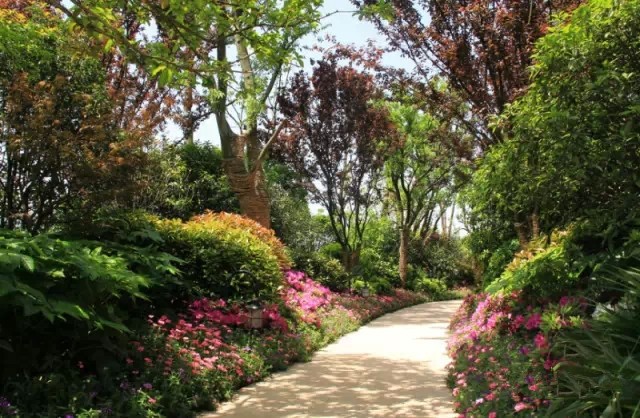 在居住小区中进行植物配置时,也应该注重其层次的搭配。利用乔灌木结合,常绿与落叶、速生与慢长相结合,乔灌与地被、草皮相结合,适当点缀些草花,构成多层次的复合结构。在进行这种层次的搭配之时,应注意乔木与灌木的比例约为1∶3~6为宜,草皮面积(乔、灌木投影范围除外)不高于绿地面积的30%。