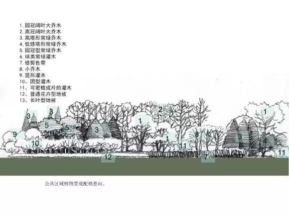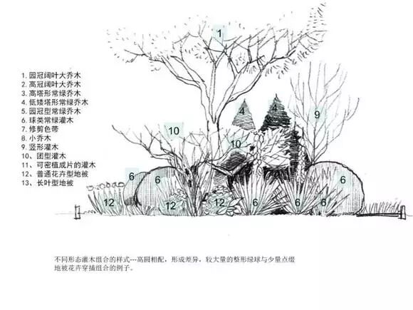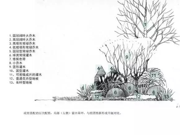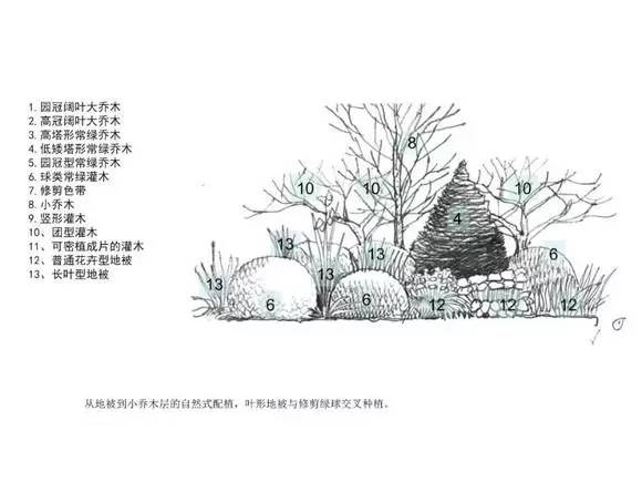 以下是几种配植类型图示,图中数码对应上页中植物形态种类序号:
