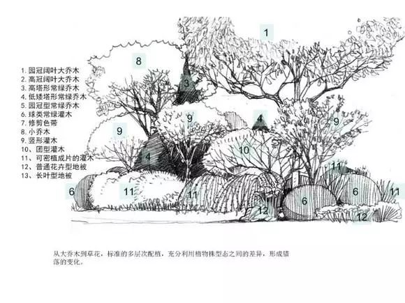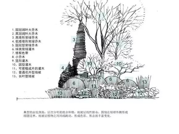 在工程实践中,所涉及的苗木形态主要有以下几种,典型植物组团的种植就是在这些形态的基础上配植产生的: