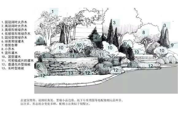此区域种植基本集中在各个住宅前,种植风格强调形态错落,乔木、灌木、草花、地被按层次分布。