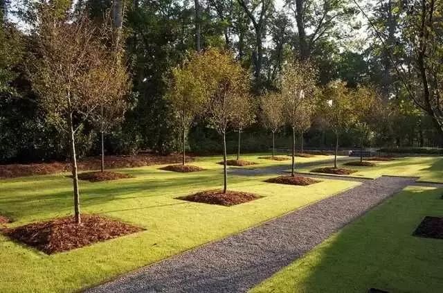 1、孤植乔灌木或行道树树穴覆盖以相对粗犷的树皮类覆盖料为主,可整齐圆形覆盖。
