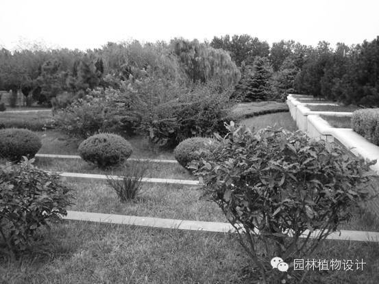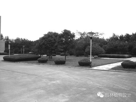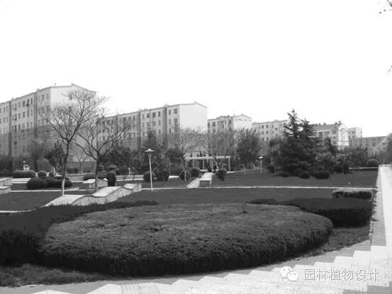 所调查的大部分城镇的道路行道树种类单一,不能很好地结合城镇总体绿地规划进行,缺乏地方特色。道路绿地的行道树树种主要以法桐(Platanus orientalis)为主。在路侧绿地中,花灌木应用较少,树种高低层次和色彩都缺乏合理配置,未能形成优美的道路景观。路侧绿地的树种主要有圆柏、大叶黄杨、龙柏、紫叶小檗。造成这种现象的原因一方面在于小城镇建设决策者的不重视,如不能开辟足够的道路绿地来进行绿化;另一方面也与城镇园林规划水平有关。夏庄在绿化时就注意到这点,多条道路行道树皆为绦柳,具有一定的特色;城阳选用樱花形成美丽街景(图7-9)。其他城镇虽也用国槐(Sophra japonica)或合欢等作为行道树种的,但不具备一定的规模,在城镇道路绿地只是零星分布。 2.2.4广场绿地植物配置 图10 河套广场局部景观 10 Local landscapee of Hetao square