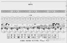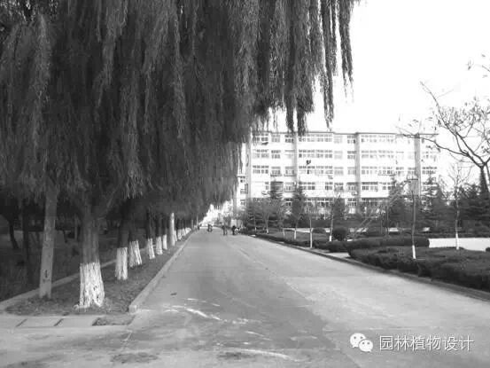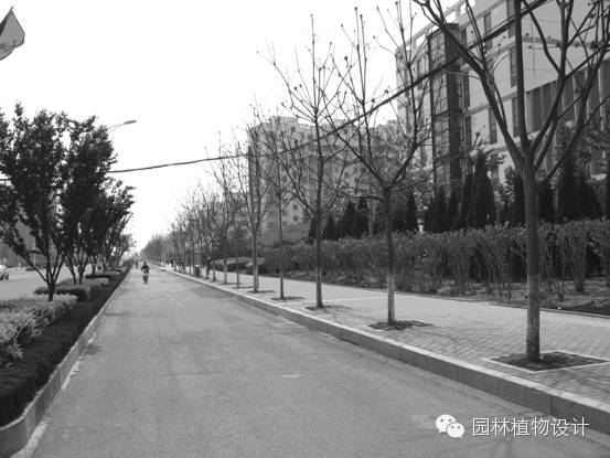 工矿企业植物配置效果惜福镇、城阳、棘洪滩和河套稍好,其余各城镇附录的厂区园林植物种类较少,植物配置方式单一,缺少季相变化(图4-6)。总体看来,厂区绿地的树种主要以绦柳、圆柏(Sabina chinensis)、龙柏、紫叶小檗(Berberis thumbergi cv. Atropurpurea)等居多,绿化基调树种为常绿植物。其他园林植物中,乔木主要有银杏(Ginkgo biloba)、合欢(Albizzia julibrissin),小乔木和灌木有樱花、月季等。 2.2.3道路绿地植物配置 图7. 城阳道路绿化平面图 7 Afforesting plane in road of Chengyang 图8. 城阳道路绿化现状拍摄图 8 Afforesting effect in road of Chengyang 图9 夏庄行道树 9 Street tree of Xizhuang