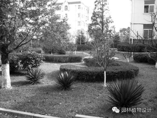 在设有广场的6个城镇中,河套、夏庄和流亭的广场园林植物相对较多,其余城镇的广场园林植物相对单一(图10)。在树种分类上,除河套和城阳2个城镇广场内的常绿树种和落叶树种比例约为1:2外,其余4个城镇的广场园林植物常绿和落叶的比例皆接近1:1。总体看来,城阳广场绿地树种种类丰富,乔灌草类型全面,树种观赏性高;其余城镇广场绿地的树种主要以雪松、圆柏、大叶黄杨、龙柏等常绿树种为主,以惜福镇为代表的部分广场内观花植物相对缺乏(图11-12)。 2.2.5公共设施绿地植物配置 图13. 夏庄植物配置 13 Plant disposition of Xiazhuang 图14. 河套政府绿化平面图 14 Afforesting plane in government of Hetao 图15. 河套政府绿化现状拍摄图 15 Afforesting effect in government of Hetao