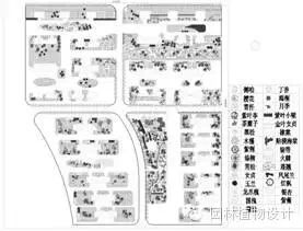 2 结果与分析 2.1植物配置总体情况 植物配置是绿化的主题,是园林规划和景观设计的主旋律。城阳区小城镇植物配置情况见表1。调查发现城阳区各城镇居住区和公共设施绿地中所用的园林植物相对城镇内其他地段较多,树种的常绿和落叶比例也较相似;工业区和城镇道路的园林植物相对较少,所用树种的常绿和落叶比例也相差很大。根据各城镇的绿化现状,结合现状拍摄照片,详细绘制了不同用地植物配置水平高低的典型绿化的平面图。 2.2不同绿地的植物配置 2.2.1居住区绿地植物配置 图1. 城阳居住小区绿化平面图 1 Afforesting plane in residential district of Shangma 图2. 城阳居住小区绿化现状拍摄图 2 Afforesting effect in residential district of Shangma 图3 流亭居住小区植物配置 3 Plant disposition of residential areas in Liuting