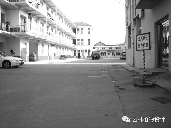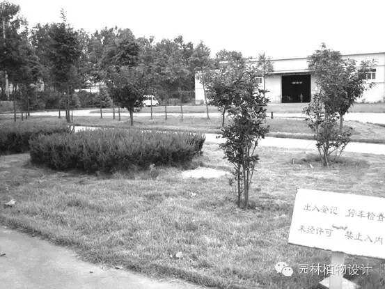 居住区绿地的植物配置方式以城阳、惜福镇、河套和流亭较为丰富;棘洪滩居住区较为单调(图1-2)。总体看来,植物配置方式形式较为灵活,季相变化较为明显。但是居住区绿地内落叶树种和常绿树种的比例大部分约为1:1-2:1,仅红岛常绿和落叶树种比例高为6:1;小区内的树种主要以雪松(Cedrus deodara)、樱花(Prunus serrulata)、月季(Rosa chinensis)、龙柏(Sabina Chinensis cv.Kaizuka)、金叶女贞(Ligustrum vicaryi)等为主。在居住区绿化所应用的其他园林植物中,乔木主要有女贞(Ligustrum lucidum)、绦柳(Salix matsudana cv. Pendula)、白蜡(Fraxinus chinensis)、玉兰(Magnolia denudata)等(图3);广玉兰(Magnolia grandiflora)、栾树(Koelreuteria paniculata)、榆树(Ulmus pumila)、(Albizzia julibrissin)等虽然也有所应用,但仅局限于个别居住区,且应用数量极少;常用的小乔木和灌木有紫叶李(Prunus cerasifera)、紫薇(Lagerstroemia indica)、紫荆(Cercis chinesis)、西府海棠(Malus micromalus)、龙爪槐(Sophra japonica var. pendula)、月季、大叶黄杨(Euonymus japonicus)和千头柏(Platycladus orientalis cv. Aurea Nana)等。 2.2.2工矿企业绿地植物配置 图4 河套厂区绿地植物配置 4 Plant disposition of factory area in Hetao