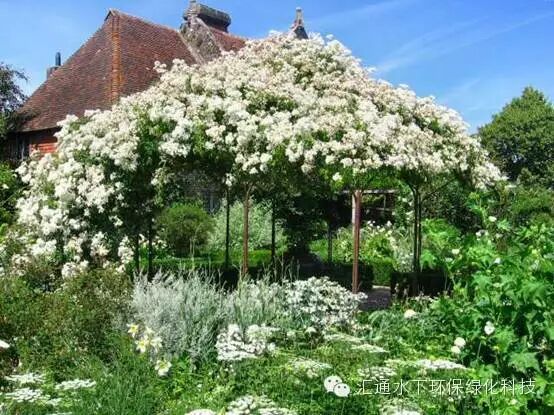 在白色花园里,花叶植物就像花园中的精灵,赋予了花园灵动之美。英国著名的西辛赫斯特城堡的白色花园就是典范——Sissinghurst  Castle Garden。这座花园由英国名媛Sackville-West-Vita(1892-1962)和丈夫Sir  Harold Nicolson在荒废了的伊丽莎白女王的大宅上修建而成。