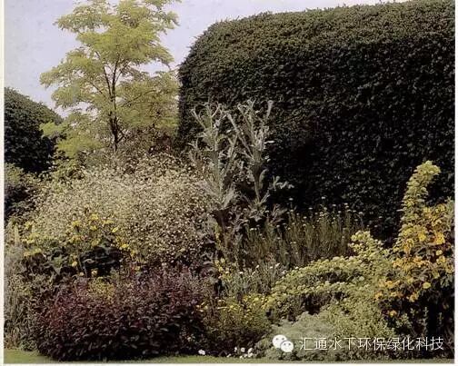 在红豆杉前面,绿色黄色紫色相互点缀洋槐成为由色彩和优势植物组成的三角形的最高点